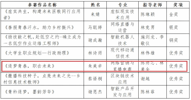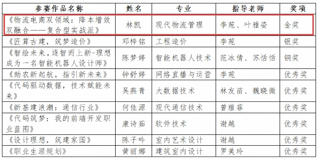 近日,由学校就业工作处与通识教育中心主办、共青团福州软件职业技术学院委员会承办的福州软件职业技术学院2025年大学生职业生涯规划大赛决赛圆满落幕。赛事自启动以来,全校学子积极响应,两百余名学子参与,经激烈角逐,数字金融产业学院2025级现代物流管理1班林凯同学以《物流电商双领域:降本增效双融合——复合型实战派》项目,荣获成长赛道金奖(指导老师:李苑、叶雅姿);2024级网络营销与直播电商2班朱美幸同学以《逐梦青春,职击未来》项目,荣获就业赛道优秀奖(指导老师:陈雨芯、林美金)。