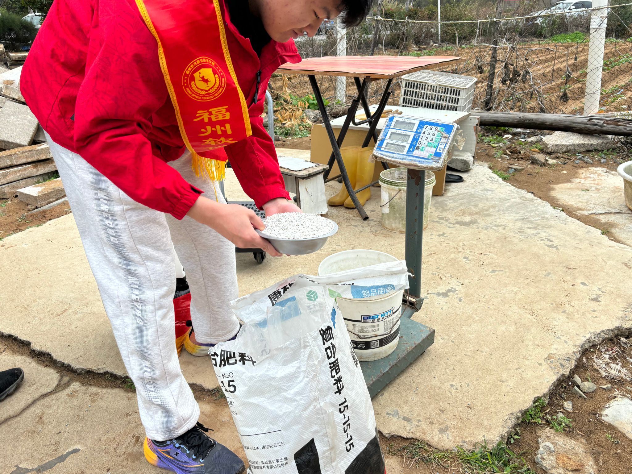 在社区居民的指导下,志愿者们称取除虫药剂。社区居民细致讲解了不同药剂的配比标准及适用虫害类型,大家根据种植地块的虫害情况精准计算药剂用量,认真核对药剂的成分标识与保质期,确保药剂无结块、无潮解,符合绿色防控要求。