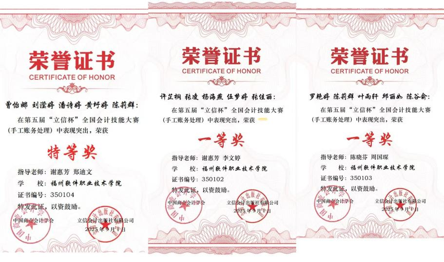 由中国商业会计学会主办、立信会计出版社承办的第五届“立信杯”全国会计技能大赛(手工账务处理)近日圆满落幕。本次大赛吸引了全国277所院校、1191组队伍参赛,经过校内选拔、组委会初评及专家现场评审等多轮激烈角逐,数字金融产业学院学子表现优异,荣获特等奖1项、一等奖2项、二等奖1项、三等奖1项,充分展现了学院在会计实践教学方面的扎实成果。