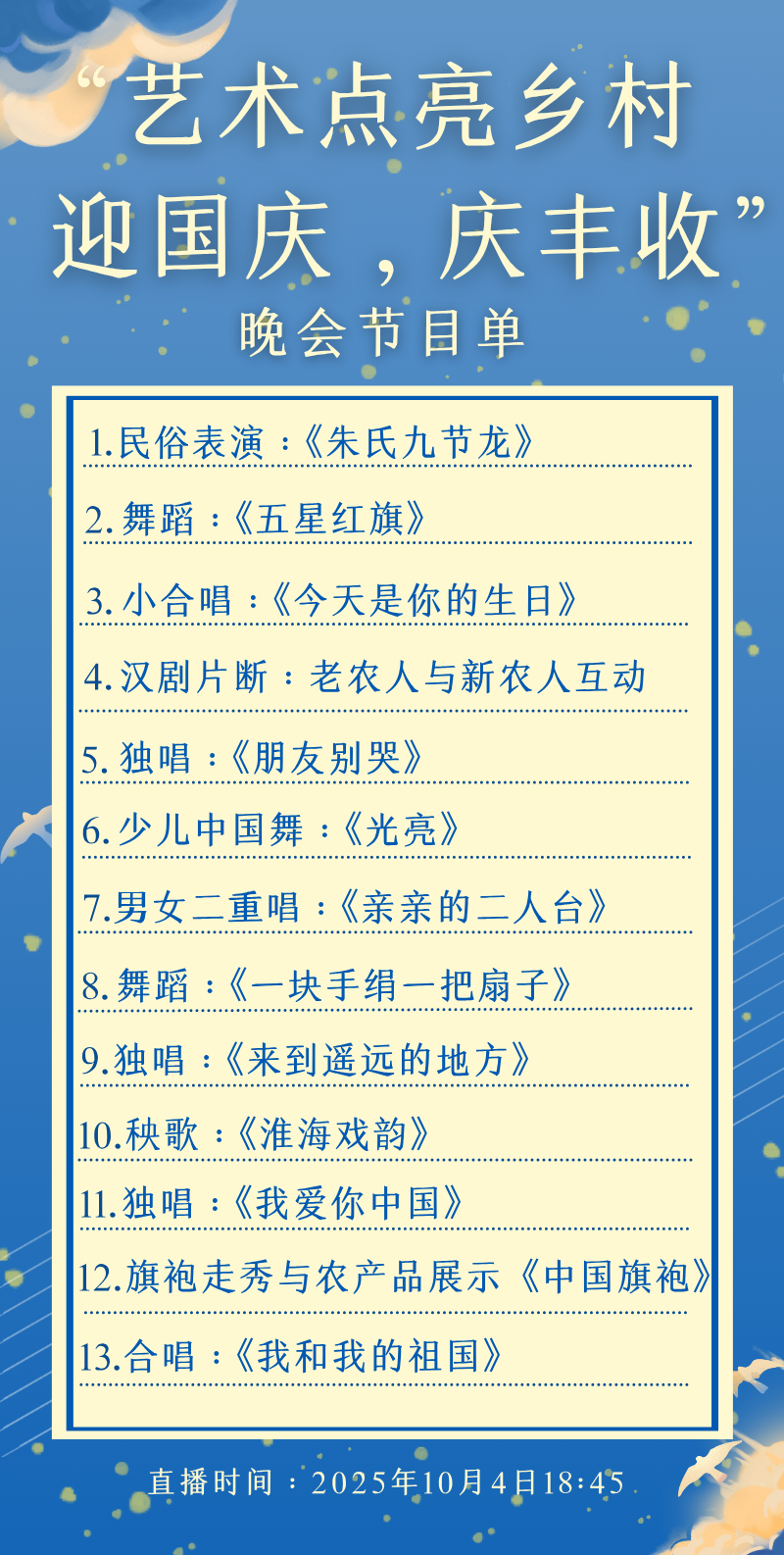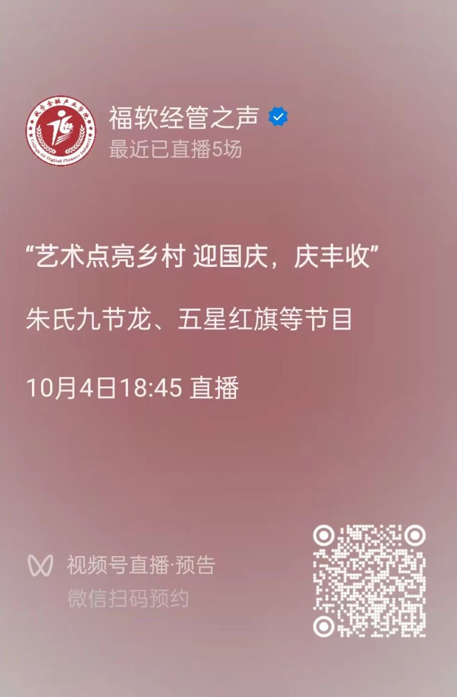 本次“艺术点亮乡村 迎国庆,庆丰收”晚会直播活动以数字金融产业学院学子助农实践为纽带,通过大学生新媒体实践,将乡村的传统文化与优质产品带入城市视野,实现“青年赋能乡村、新媒体助力振兴”的目标。10月4日18:45,锁定直播间,共同感受新时代乡村振兴的蓬勃生机!