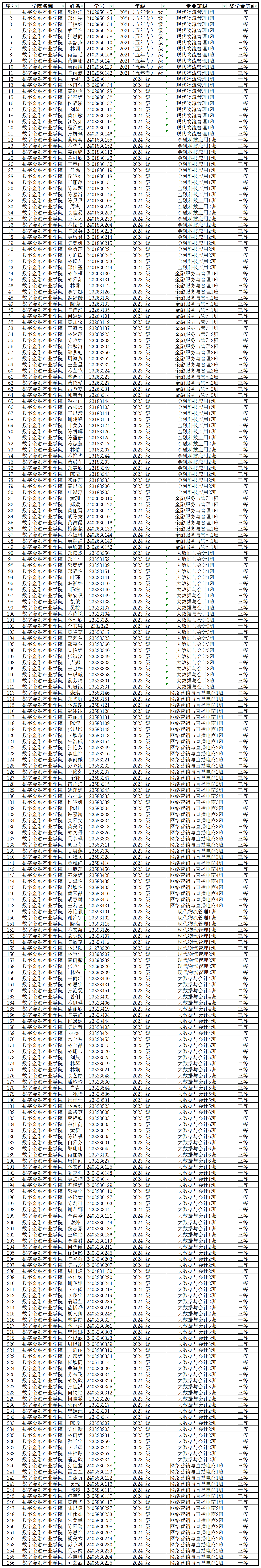根据《福州软件职业技术学院奖学金管理规则》有关规定,在综合考评基础上,审查通过2024-2025学年第二学期学院奖学金获奖学生名单,现予以公示。学院奖学金获奖学生名单详见附件1,公示期为3个工作日(2025年11月6日-11月8日)。如对名单有异议,请在公示期内向数字金融产业学院反映。联系人:张老师; 联系电话:18558860993;电子邮箱:3089603820@qq.com。
