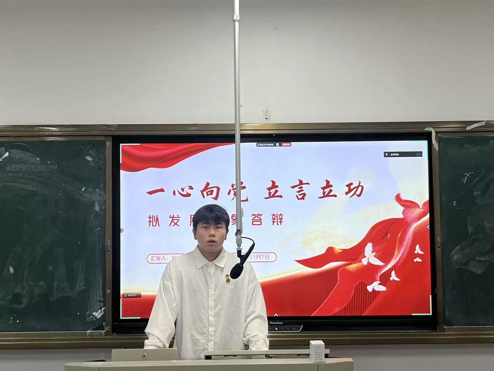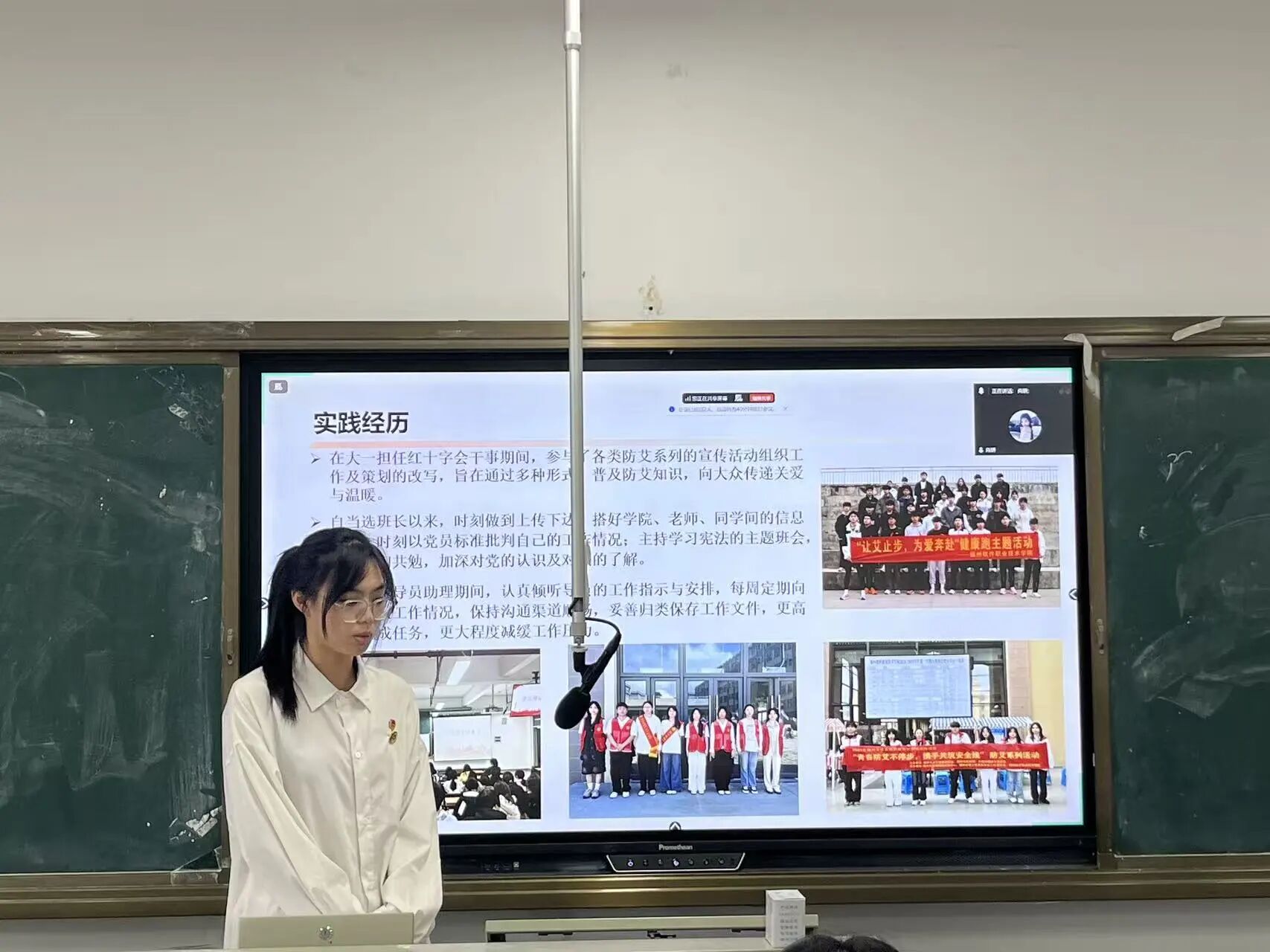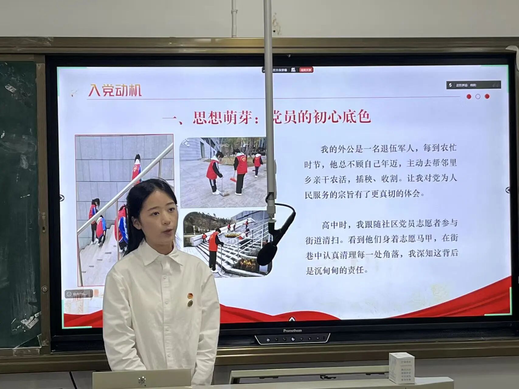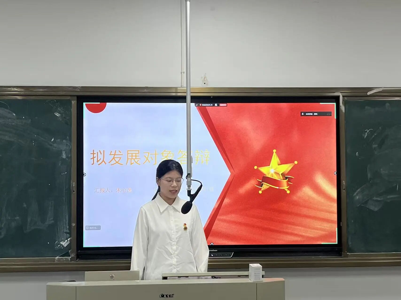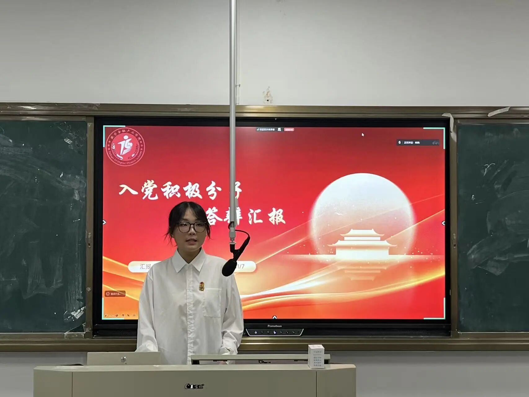 会议开始,主持人夏欣悦同学就答辩流程与注意事项向与会师生作了详细说明。在个人陈述环节,10名拟发展对象依次上台进行自我陈述。他们围绕入党动机、学业成绩、工作实践与日常生活四个维度展开汇报,深入阐述个人的入党初心与实践历程。支部评委结合学生陈述内容,从党的理论知识掌握、时事政策理解、在校综合表现等多个角度进行针对性提问,全面考察拟发展对象在培养期间的思想政治表现,进一步评估其党性修养与理论水平。