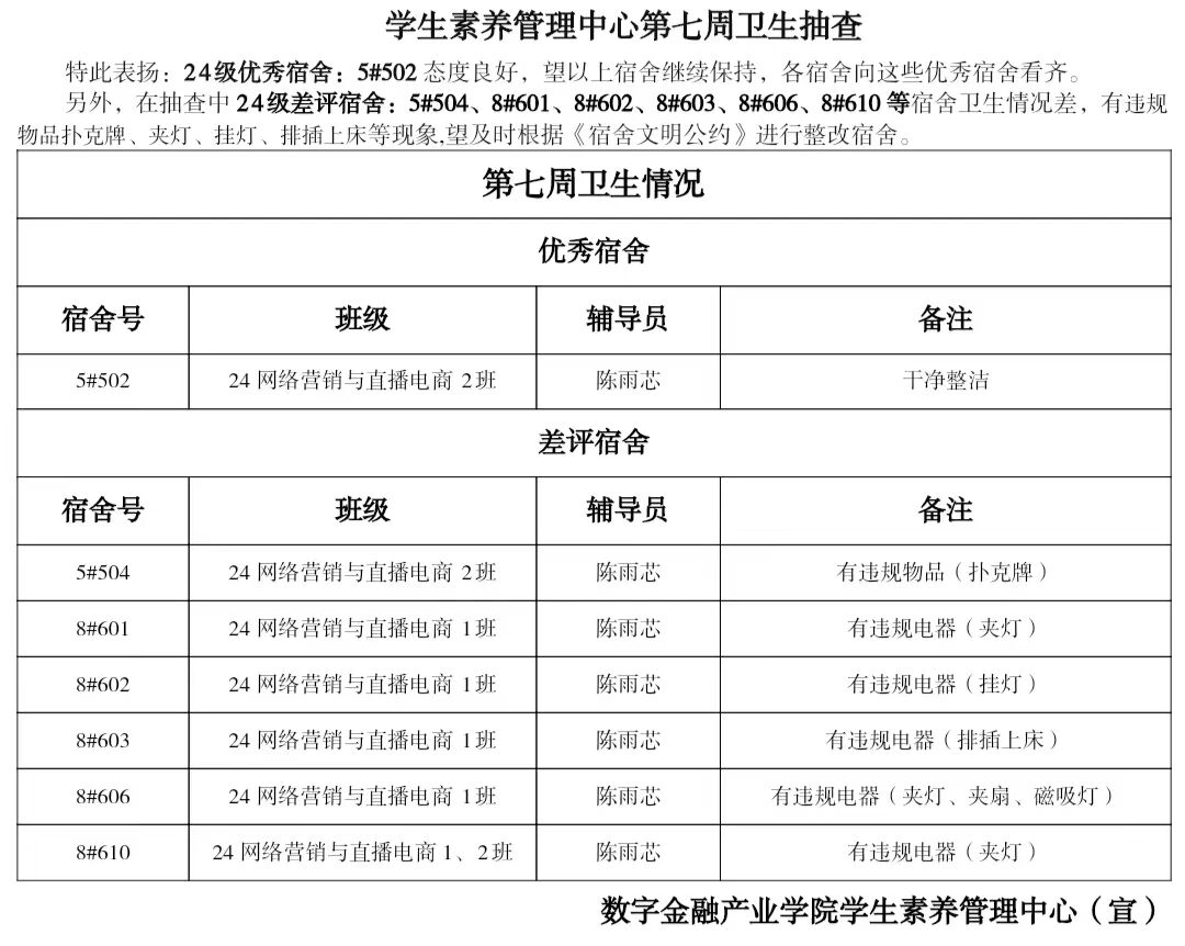 在第七周的卫生抽查情况中,宿舍卫生整洁,态度良好,希望优秀宿舍继续保持,各宿舍向这些优秀宿舍看齐。另外,在抽查中也发现有些宿舍存在扑克牌、夹灯、排插上床等违规物品,以及桌面杂乱、椅背有衣物等不文明现象,希望及时根据《宿舍文明公约》进行整改。