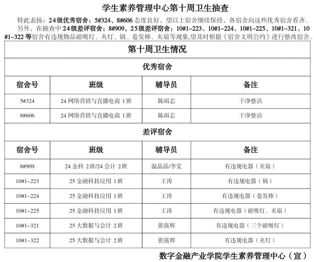 在第十周的卫生抽查情况中,宿舍卫生整洁,态度良好,希望优秀宿舍继续保持,各宿舍向这些优秀宿舍看齐。另外,在抽查中也发现有些宿舍存在夹扇、锅、卷发棒等违规物品,以及桌面杂乱、椅背有衣物等不文明现象,希望及时根据《宿舍文明公约》进行整改。