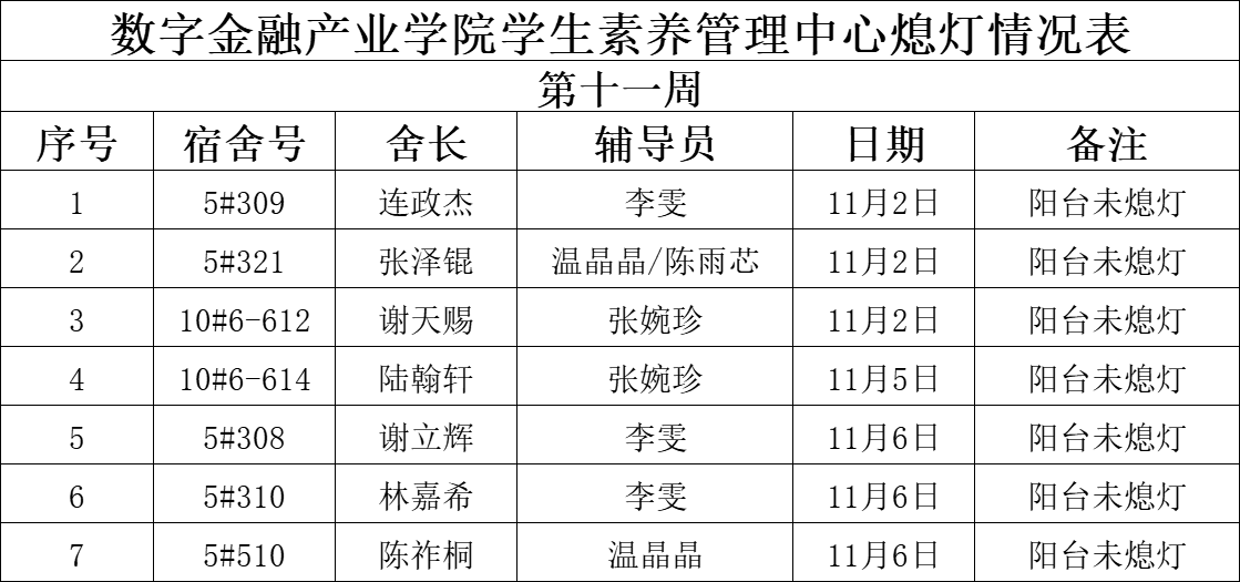 第十一周(11月2日~11月6日)学生素养管理中心对宿舍文明行为进行检查,工作情况如下: