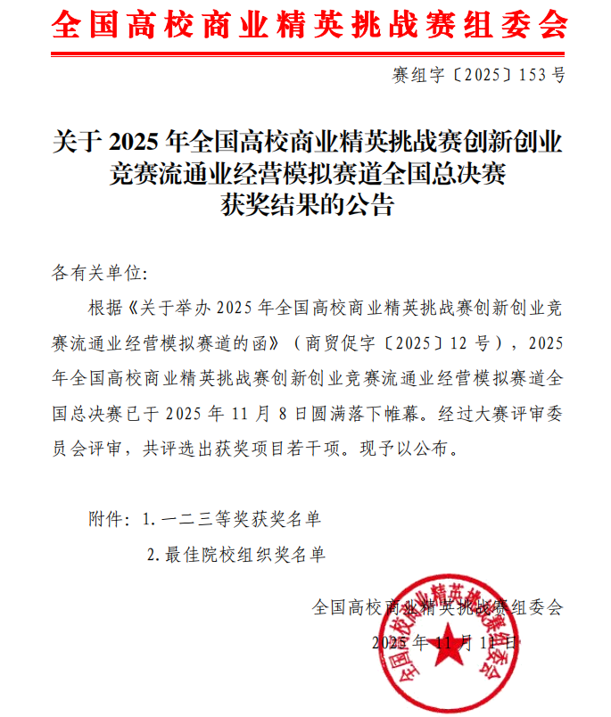 11月8日,由中国国际贸易促进委员会商业行业委员会、中国国际商会商业行业商会和中国商业经济学会共同主办的2025年全国高校商业精英挑战赛创新创业竞赛流通业经营模拟赛道全国总决赛获奖名单正式公布。数字金融产业学院李文婷、洪丽彬老师指导的参赛团队(团队编号:TC01,成员:张晓云、董碧英、林得),凭借出色的表现,荣获全国一等奖。