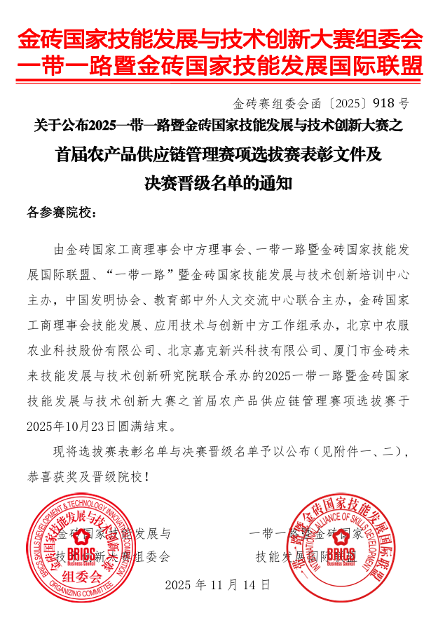近日,2025年第九届一带一路暨金砖国家技能发展与技术创新大赛“首届农产品供应链管理赛项”全国选拔赛中。我校数字金融产业学院现代物流管理专业选派的学生团队,在全国249支参赛队伍中脱颖而出,凭借扎实的专业功底与出色的实战能力,成功斩获选拔赛南区二等奖,充分展现了我校在物流管理领域的人才培养成效与教学实力。