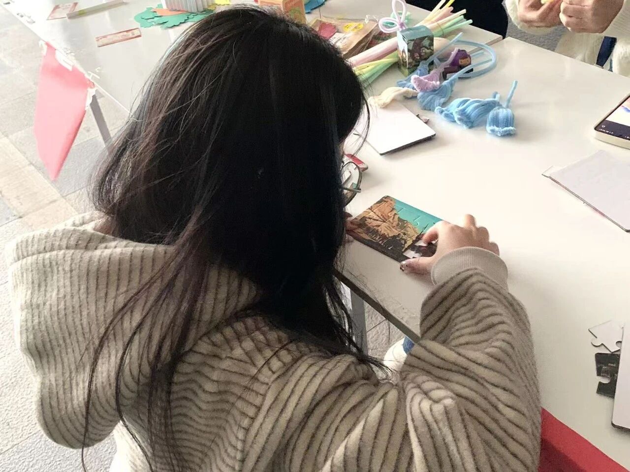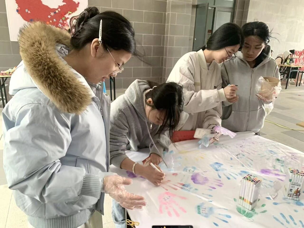 以创意为笔,以行动为墨。“手印铭志”活动中,同学们在集体画布上按下手掌印,写下“奋斗”“勿忘”“自强”等时代强音,共同绘就“红色印记墙”;“繁花缀山河”活动以中国地图为载体,同学们用扭扭棒编织“繁花”点缀疆域,用创意致敬“山河无恙因英烈守护”,让红色精神在指尖流转、在心中扎根。