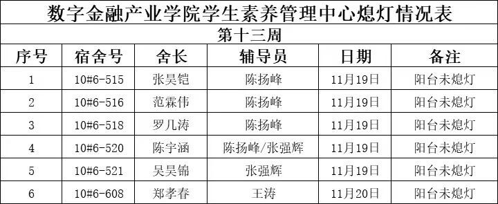 第十三周(11月16日~11月20日)学生素养管理中心对宿舍文明行为进行检查,工作情况如下: