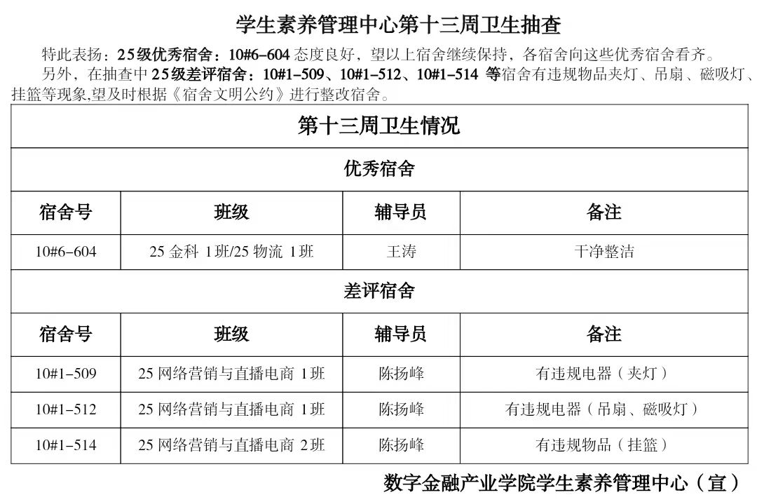 另外,在抽查中也发现有些宿舍存在夹扇、吊扇、磁吸灯、挂篮上床等违规物品,以及桌面杂乱、椅背有衣物等不文明现象,希望及时根据《宿舍文明公约》进行整改。