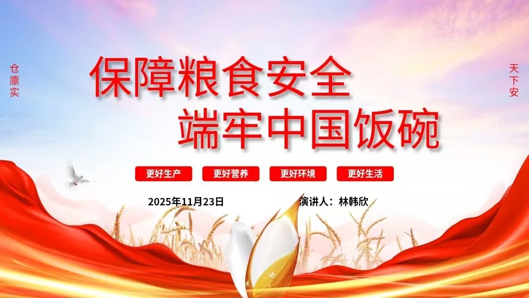 随后,林韩欣同志分享,面对资源约束与国际风云变幻等挑战,破局之道在于将“手中有粮、心中不慌”的真理落到实处。她呼吁,必须坚守耕地红线,依托“藏粮于地、藏粮于技”战略,建好高标准农田,做强农业“芯片”;同时深化供给侧改革,让粮食产业既固安全之本,又强效益之基。唯有将粮食安全的主动权牢牢攥在掌心,方能托举这中国饭碗,行稳致远。