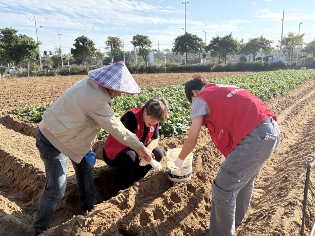 土壤整理完毕后,志愿者们领取有机肥与施肥工具,按照带队老师指导的“均匀撒播、薄厚适中”原则开展作业。大家将肥料均匀摊开在地块表面,使肥料与土壤充分混合,为土豆生长提供充足养分,确保土壤肥力均匀覆盖整个种植区域。