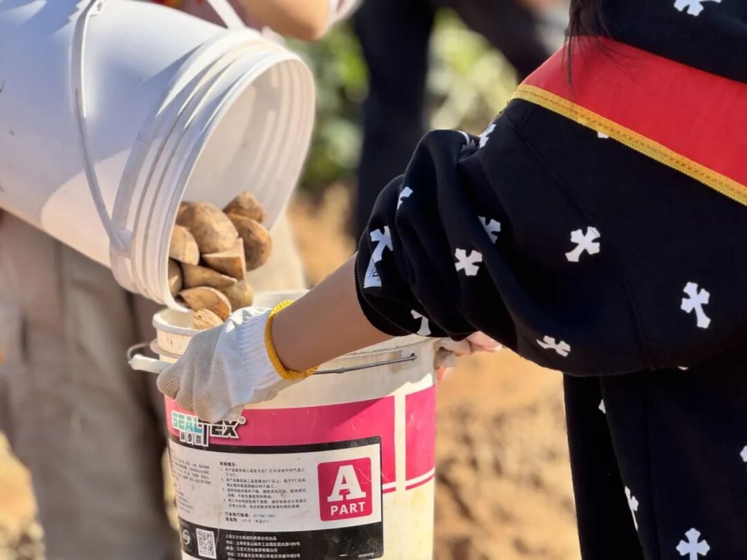 在掌握种植要领后,志愿者们分工协作开展土豆种植工作。大家先将经过挑选的种薯按芽眼朝向整齐摆放在种植沟内,确保每个种薯间距均匀、芽眼朝上;随后用铁锹轻轻回填土壤,将种薯完全覆盖,并用脚轻轻压实表层土壤,防止浇水后土壤塌陷;完成整个种植流程,期待种薯在精心照料下顺利发芽生长。