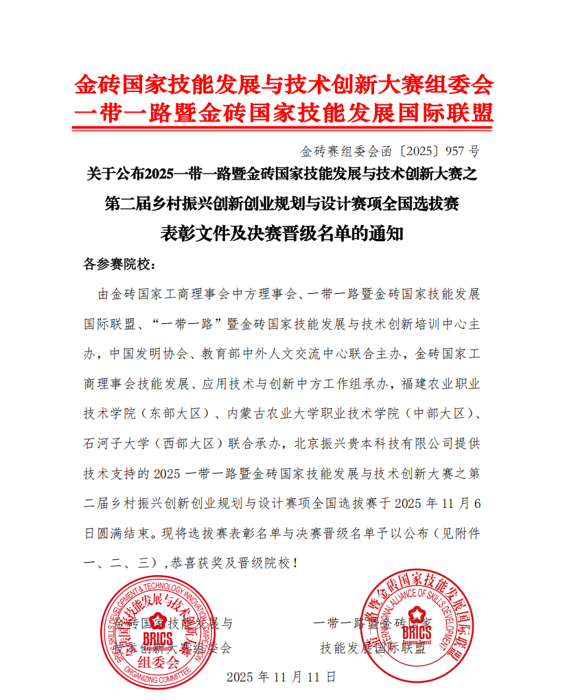 本次赛项精准对接国家乡村振兴战略与数字乡村建设需求,聚焦乡村产业规划、电商运营、农旅融合设计等前沿场景,全面检验参赛选手的创新思维、项目落地与综合职业能力。此次获奖是学院坚持“以赛促创、创教融合”人才培养模式的重要硕果。未来,学院将紧扣乡村数字经济新业态,将乡村振兴竞赛标准深度融入专业群建设与课程模块改革,通过“校地协同、岗课赛证”一体化育人机制,持续锤炼学生的项目实战与创新创业能力。