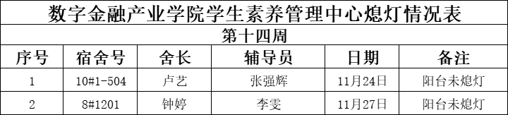 第十四周(11月23日~11月27日)学生素养管理中心对宿舍文明行为进行检查,工作情况如下: