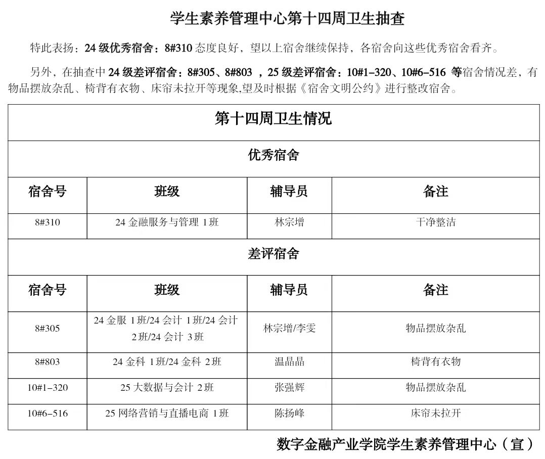 在第十四周的卫生抽查情况中,宿舍卫生整洁,态度良好,希望优秀宿舍继续保持,各宿舍向这些优秀宿舍看齐。